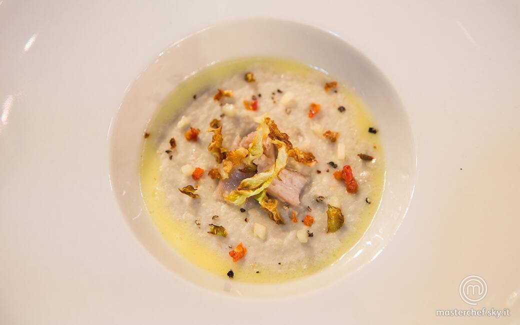 Sbucciare la cipolla, tritarla e farla imbiondire in una padella con olio extravergine di oliva. Scolare i fagioli giunti a cottura, metterli in una ciotola e frullarli insieme alla cipolla fino a ottenere una crema densa.