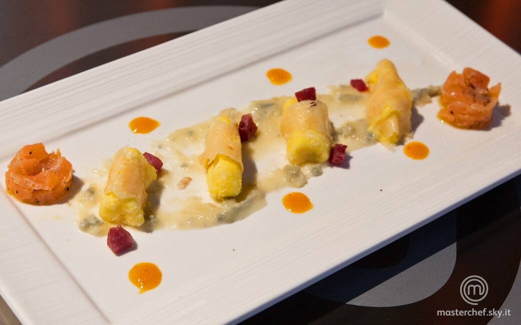 Distribuire la crema di gorgonzola nei piatti, allungandola in una striscia, adagiarvi sopra le quenelle di ricotta e cospargere con i cubetti di salame. Utilizzando un coppapasta piccolo, posizionare sui due lati la tartare di salmone e completare con alcune gocce di salsa ai peperoni.