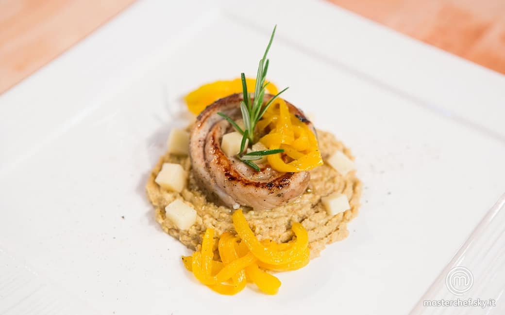 Creare nei piatti una base di purè di verza e adagiarvi sopra le girelle di aringa. Cospargere con i peperoni e i dadini di formaggio, guarnire con ciuffetti di rosmarino e completare con una spolverata di pepe.