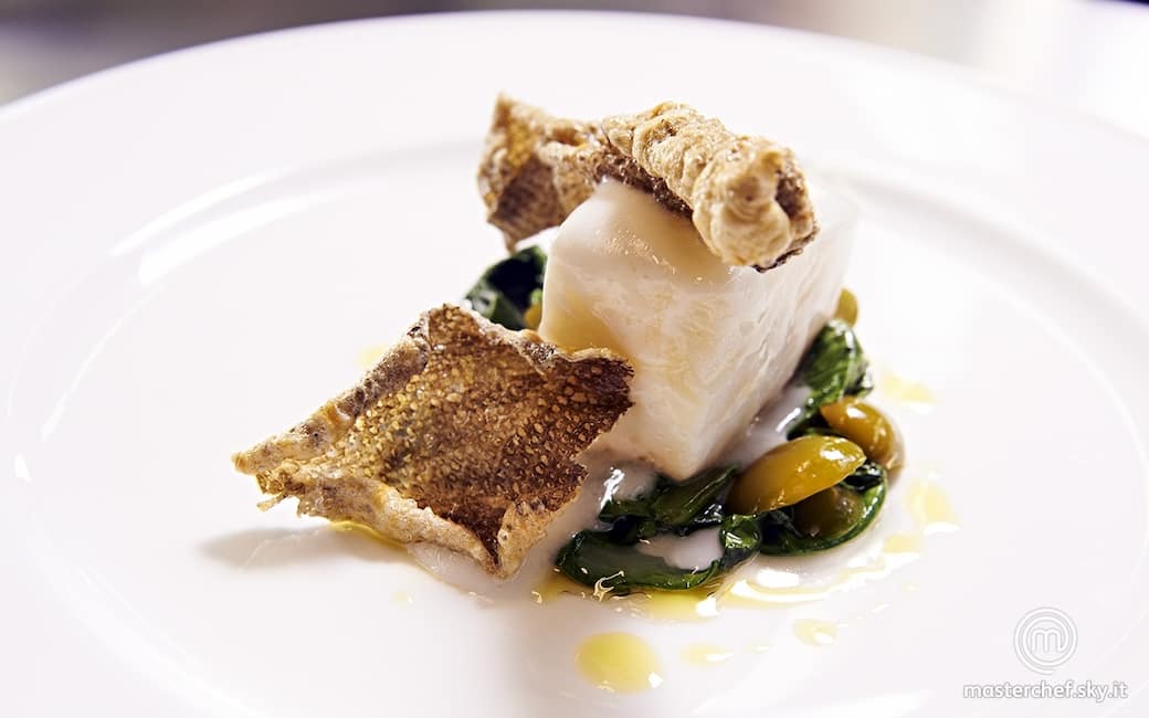 Distribuire le erbette con le olive nei piatti, adagiare sopra i tranci di baccalà, insaporire con una cucchiaiata di maionese e completare con le chips croccanti di pelle.