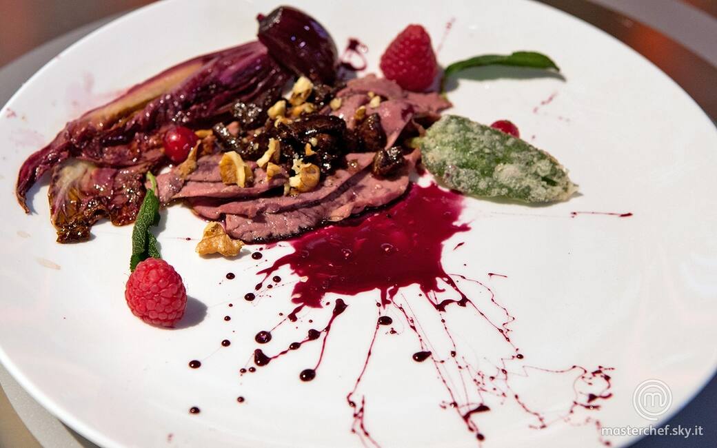 Mettere poca riduzione di vino sui piatti e con un cucchiaio allargarla in modo da formare degli “schizzi”. Disporre su un lato le fettine di carpaccio e sopra il ragù. Appoggiare di fianco il radicchio e lo scalogno caramellato, completando con i frutti rossi e i gherigli di noce tritati.