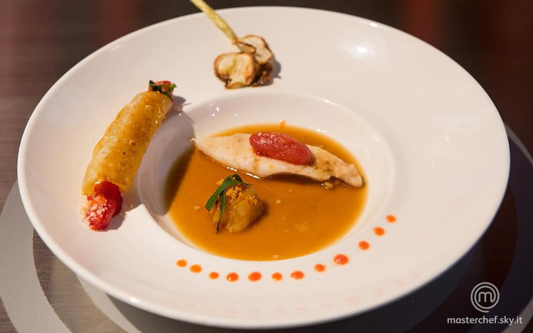 Versare poco fumetto di pesce nelle fondine e adagiarvi sopra un filetto di San Pietro con un pomodorino al forno e un cucchiaio di tartare di scampi. Disporre su un lato il cannolo di pane croccante e “chiuderlo” con 2 pomodorini al forno. Adagiare di fianco le chips di rapa e guarnire con alcune gocce di emulsione di pomodoro.