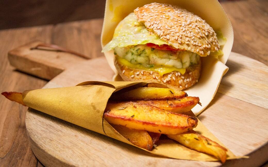 Cuocere i fishburger in una padella con un filo d’olio extravergine di oliva fino a formare una crosticina. Tagliare a metà i panini e farcirli con i burger, una fettina di pomodoro, una foglia di insalata e la maionese. Disporre su un tagliere piccolo ogni fishburger, appoggiandolo su un tovagliolo colorato, e accompagnarlo con le patate al burro in un cono di carta.