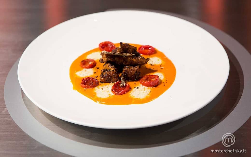 Quando i pomodori saranno quasi pronti, aggiungere il concentrato di pomodoro e terminare la cottura. Togliere dal fuoco, incorporare la fonduta di mozzarella, frullare il tutto e passare al chinois. Far restringere fino a ottenere una crema, poi tenere da parte in caldo. Riunire la restante mozzarella a dadini con poco caffè in polvere, condire con un pizzico di sale e lavorare il formaggio, versando poco olio, fino a ottenere una crema.