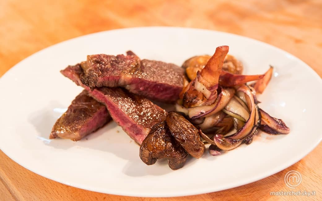 Distribuire le fette di controfiletto nei piatti e adagiarvi di fianco i funghi e il radicchio. Condire con poca riduzione di porto e completare con un filo d'olio, un pizzico di sale e una macinata di pepe.