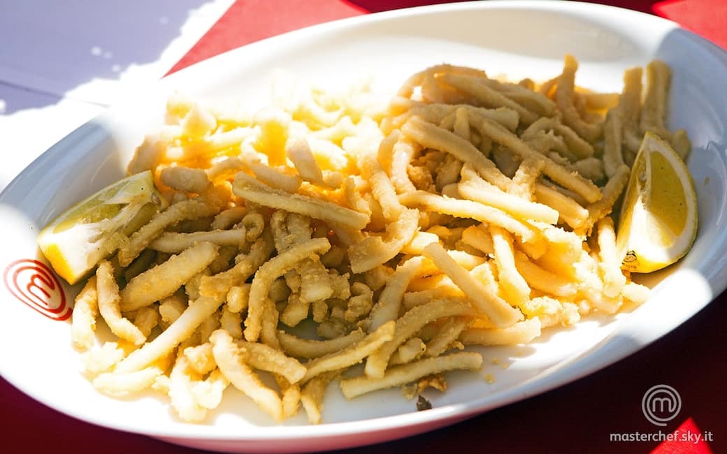 Staccare la testa con i tentacoli dal mantello dei calamari, eliminare la penna di cartilagine, la pelle che lo riveste e le interiora. Sciacquare bene, asciugare e tagliare il mantello a striscioline, lasciando interi i tentacoli, dopo aver eliminato gli occhi e il becco corneo. Tamponare bene tutti i pezzi con carta assorbente da cucina.