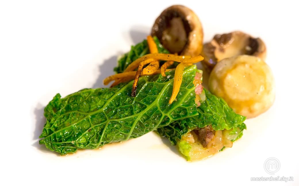 Distendere le foglie di verza e distribuirvi sopra il formaggio a fettine, poi la carne di maiale e completare con la salsiccia. Arrotolare le foglie in modo da ottenere gli involtini e passarli in forno a 200 °C per 6-7 minuti, o in alternativa cuocere in padella con un filo d'olio per un tempo simile, rigirandoli delicatamente.