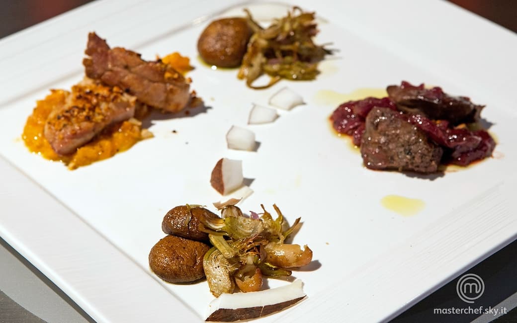 Distribuire il chutney di albicocche in un angolo dei piatti e adagiarvi sopra le animelle. Adagiare sul lato opposto i fegatini di pollo con la salsa all'uva e negli altri angoli i funghi con i carciofi e i fagioli. Completare disponendo al centro i cubetti di cocco conditi con un filo d'olio, sale e pepe.