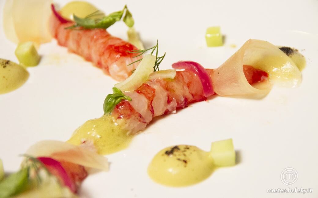 Lavoare nel mixer il composto di limone ormai freddo, versando a filo 20 g di olio di semi di vinacciolo e altrettanto olio extravergine di oliva, fino a ottenere un gel spatolabile. Pulire i gamberi, appoggiarli in un piatto rettangolare e condirli con il gel di limone, olio extravergine di oliva, sale e pepe.
