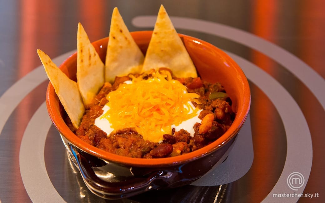 Distribuire il chili nelle fondine e adagiarvi nel mezzo qualche cucchiaio di panna acida. Grattugiare a filetti il cheddar e disporlo sopra la panna, completando con i nachos su un lato.