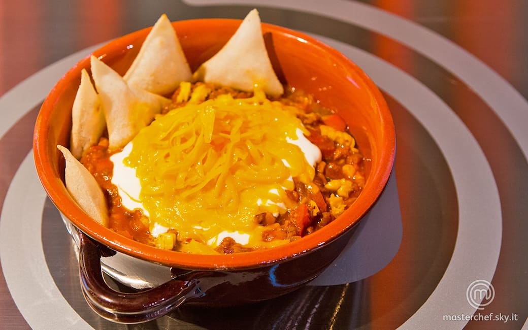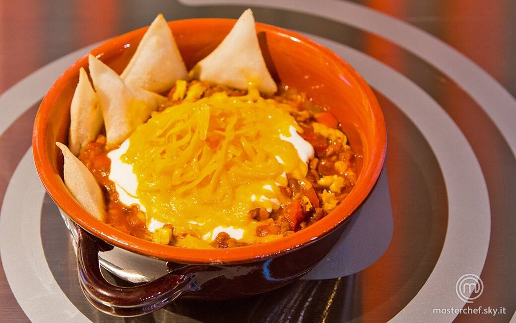 Regolare di sale e pepe il chili e distribuirlo ancora ben caldo nei piatti. Adagiare sopra la panna acida e coprirla con il formaggio, completando con le tortillas di lato.