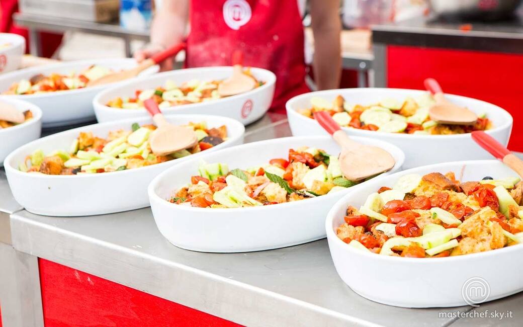 Sfornare i pomodorini e lasciarli raffreddare, quindi trasferirli in una ciotola. Unire il pane, la cipolla, il cetriolo e le olive. Condire con abbondante olio, insaporire con poco sale, unire le foglie di basilico tagliuzzate e mescolare bene.