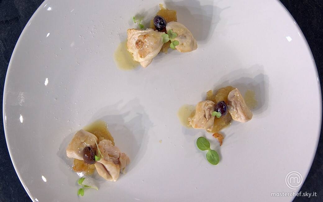 Creare 3 mucchietti di chutney di mele in ogni piatto e adagiare sopra ciascuno un cubetto di coscia e uno di lombo. Nappare con il fondo di cottura della carne, completare con le olive e guarnire con i germogli.