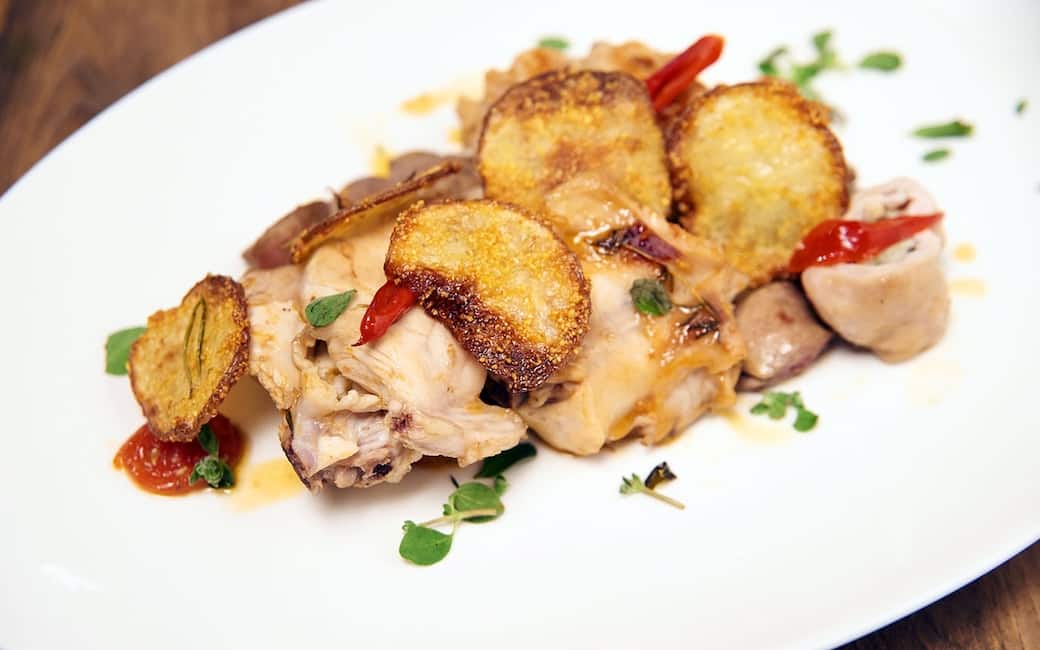 Sfornare le patate. Tagliare gli Involtini. Fare un letto con il sugo del coniglio, adagiarvi i pezzi di coniglio e gli involtini tagliati. Aggiungere due chips di patate e spolverare con erbe aromatiche