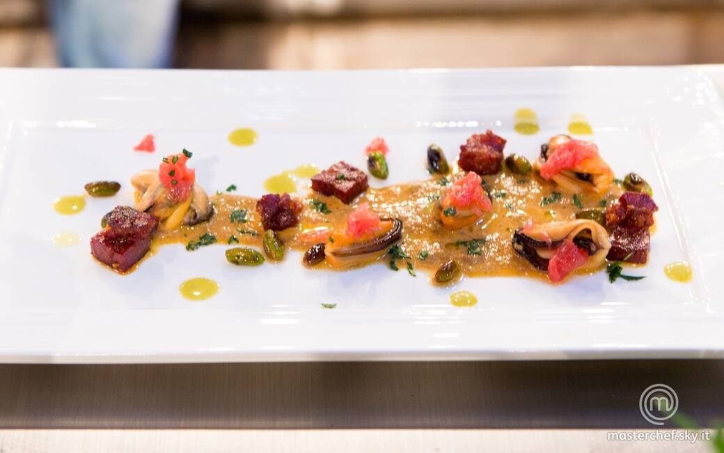 Distribuire la salsina ottenuta dal fondo di cottura nei piatti e cospargere sopra le cozze, i pistacchi tostati, il chorizo e pezzetti di pompelmo, completando con qualche goccia di salsa di pistacchi e prezzemolo tritato grossolanamente.