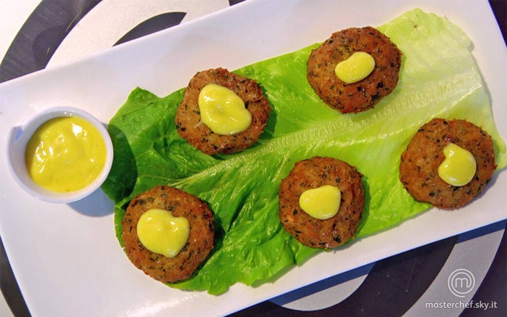 Adagiare una foglia di lattuga su ogni piatto e disporvi sopra le crab cakes, accompagnando con la salsa aioli a parte.