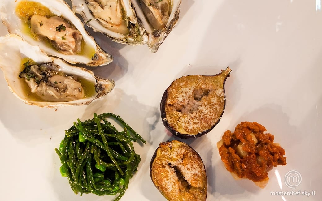 Distribuire il fondo di cipolla e fico nelle valve delle ostriche e adagiarvi sopra le ostriche, quindi condire con lo sciroppo dei fichi e spolverare con poca menta spezzettata. Condire insieme la salicornia e i piselli con olio, sale, menta e barba di frate tritate, poi posizionarli nei piatti di fianco alle ostriche aiutandosi con un coppapasta. Sempre utilizzando un coppapasta, completare con i ceci su cui disporre la polpa dei ricci. Regolare di sale e pepe e guarnire con i fichi caramellati.