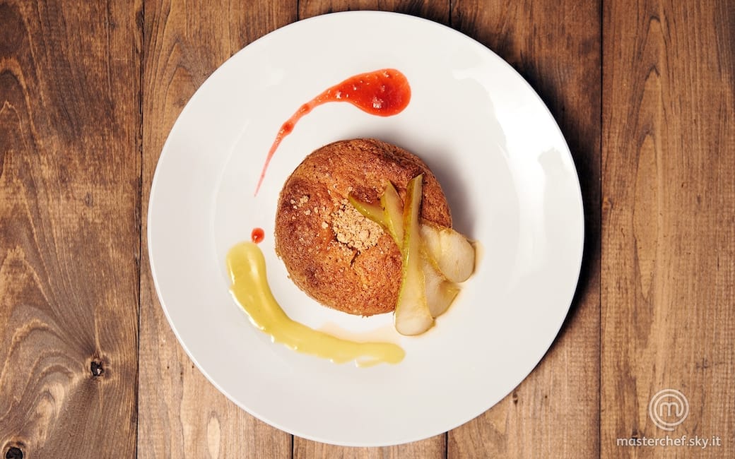 Scavare leggermente i tortini ancora caldi, creando un piccolo buco sulla cupola. Versare all’interno la salsa inglese al Blu di Morozzo e coprire il buco con degli amaretti sbriciolati. Appoggiare i tortini ripieni sui piatti, guarnire con la coulis di lamponi e un tocco di crema inglese, completando con le fettine di pera caramellata.