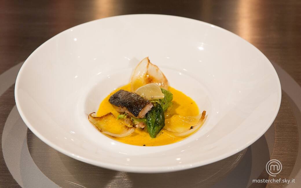 Sfornare e spellare i peperoni, poi tagliarli a pezzi. Metterli in una padella con un filo d'olio, lasciarli rosolare brevemente, poi aggiungere il fumetto di pesce e lasciarlo ridurre. Frullare con il frullatore a immersione, unendo poco olio, quindi passare la salsa in un colino a maglie fitte.