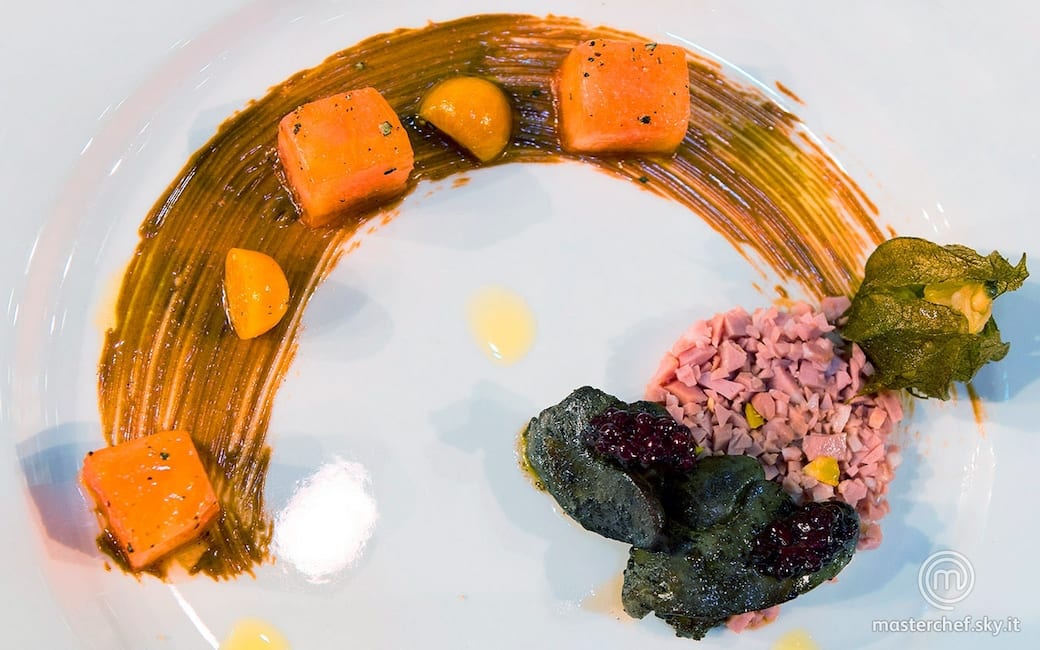 Creare nei piatti una pennellata semicircolare di crema di gianduia e adagiarvi sopra l'anguria e gli alchehengi marinati. Riempire le foglie di alchehengi con le vongole e il loro fondo di cottura e appoggiarle all'estremità della pennellata. Adagiare di fianco il battuto di mortadella e i fegatini con i lamponi, completando con un filo d'olio.
