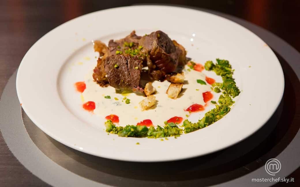 Versare al centro del piatto la crema di formaggio e disporvi sopra il filetto. Distribuire su un lato gli asparagi a pezzetti, guarnire con l'acqua di pomodoro, condire con un filo d'olio e regolare di sale.