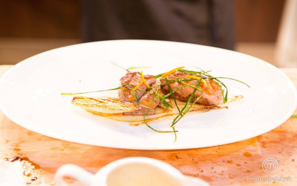 Adagiare i petti d'anatra nei piatti, con la pelle croccante rivolta verso l'alto. Condirli con la riduzione di arancia, adagiare di fianco i cipollotti caramellati e competare con la julienne di scorze d'arancia e verde di cipollotto.