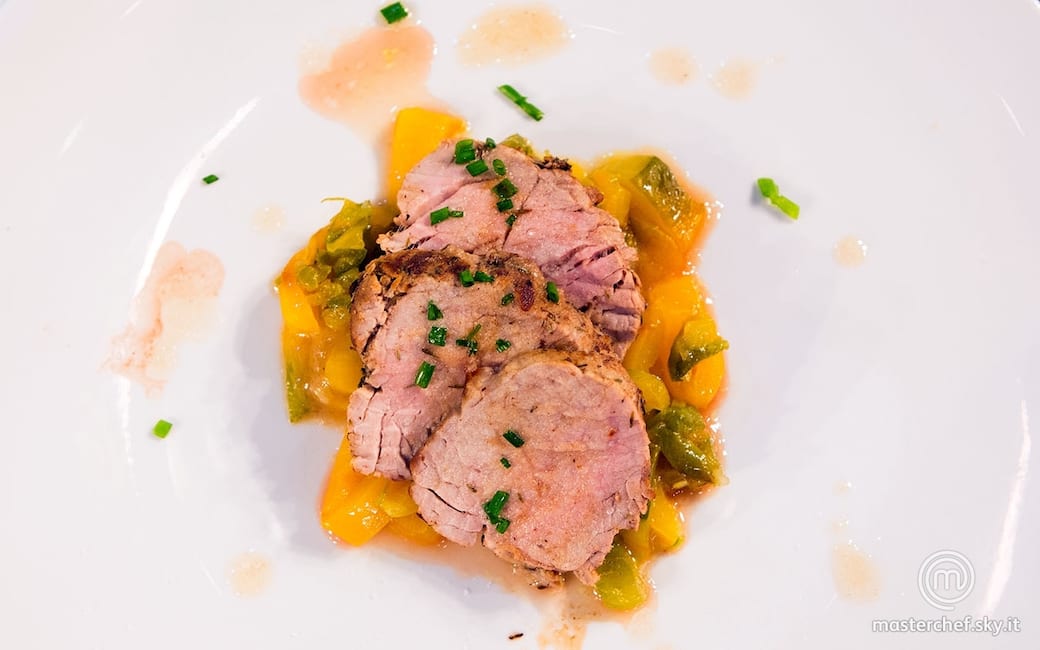 Filetto di maiale alla senape su letto di peperoni in due cotture