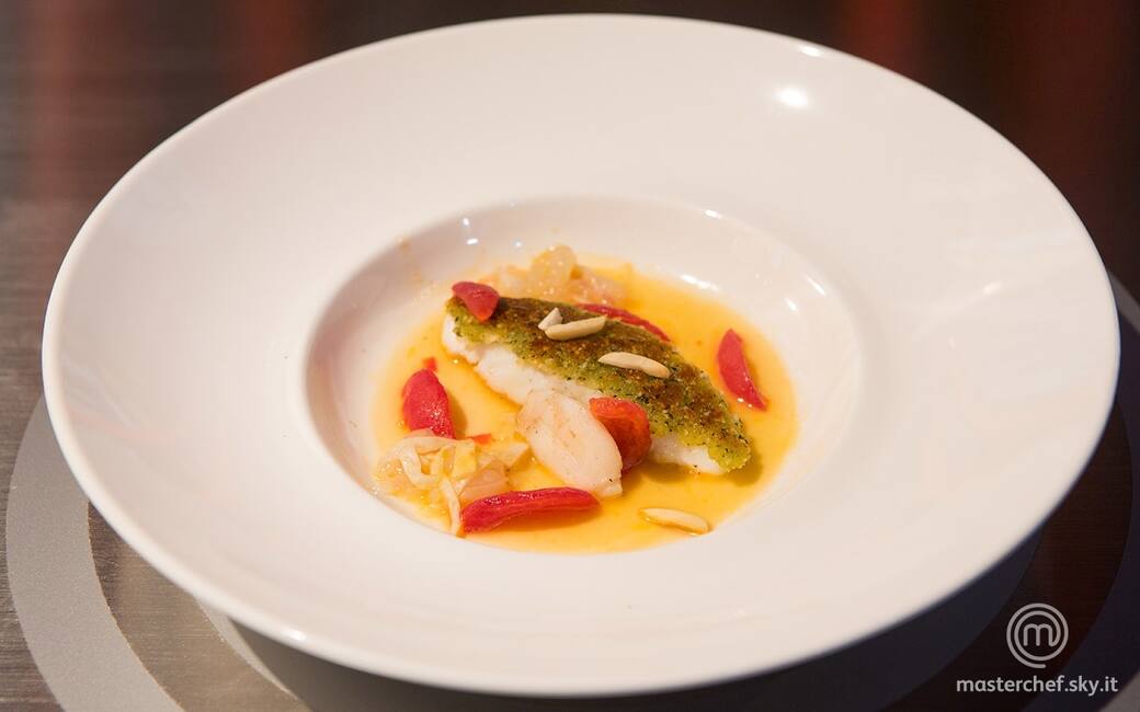 Versare nei piatti 5-6 cucchiai di bisque di scampi e adagiare al centro il pesce. Aggiungere ai lati l'insalatina di scampi e rapa e completare distribuendo sopra i pomodori e le mandorle.