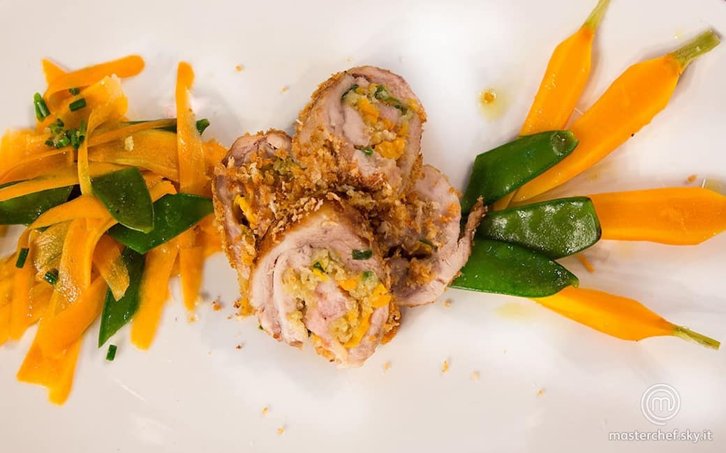 Pelare le carote, senza eliminare il ciuffo, e cuocerle al vapore per 20 minuti insieme alle taccole. A cottura ultimata, mettere entrambe in una ciotola con acqua e ghiaccio. Tagliare 2 carote a brunoise e farle rosolare in una padella insieme al panko e un filo d'olio per pochi minuti. Aprire e distendere le cosce di pollo, quindi farcirle con il composto di carote e panko. Arrotolare le cosce aiutandosi con la pellicola per cucinare e utilizzarne altra per sigillarle bene. Cuocere le cosce imemrgendole in acqua a 80 °C per 10 minuti.