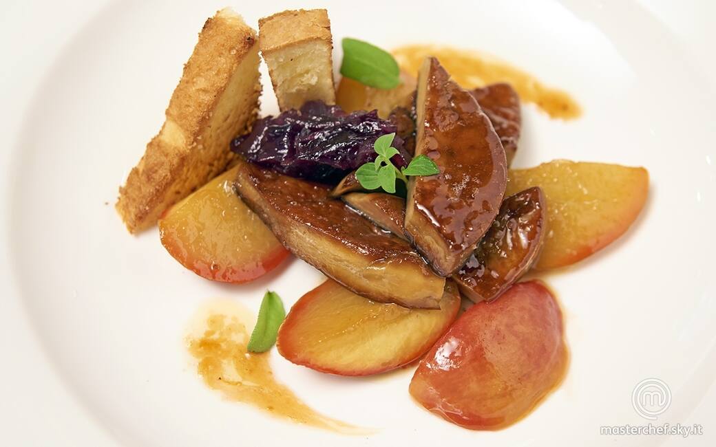 Dorare il foie gras su entrambi i lati in una padella rovente per pochi minuti. Trasferire il foie gras nel tegame con le pesche, amalgamare il tutto e lasciare insaporire per alcuni minuti.