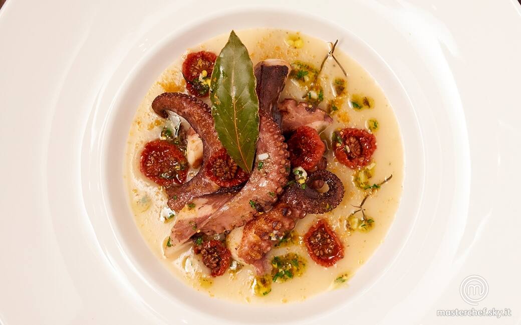 Frullato di patate con polpo brasato, pomodorini passiti e bottarga di muggine