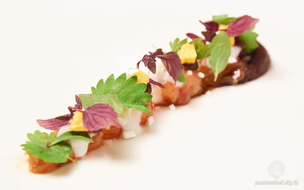 Pulire i gamberi e conservarne solo la polpa. Dividere i gamberi in 3, condirli con olio e sale di Maldon e lasciarli riposare in una boule.