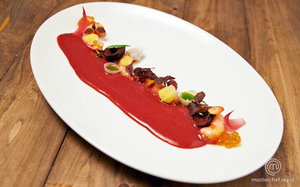 Frullare con il frullatore a immersione i pomodori, i peperoni, il cetriolo senza semi, la maionese, poca granatina, il succo di ciliegie e le ciliegie denocciolate, la rapa cruda, un po’ di aceto, olio, altra erba cipollina (tenendone da parte alcuni fili) e parte delle cipolline sott'aceto. Filtrare il composto ottenuto con un colino e addensare con un po’ di gomma xantana. Conservare il gazpacho in frigorifero. Sbollentare per 30 secondi i pomodorini, raffreddarli in acqua e ghiaccio, spellarli e tagliarli in 4.