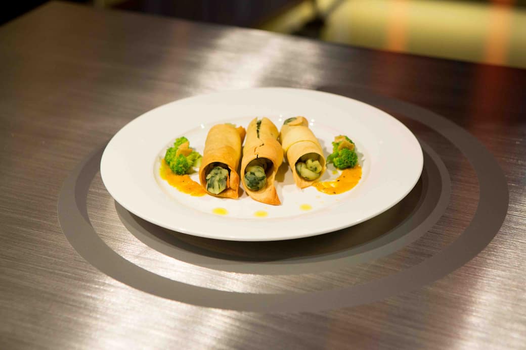 Posizionare 3 cannoli al centro di ogni piatto e adagiare ai lati la crema dolce di zucca e carote. Guarnire con i fiori di cime di rapa conditi con l’olio all’aglio e completare con qualche goccia dello stesso olio.