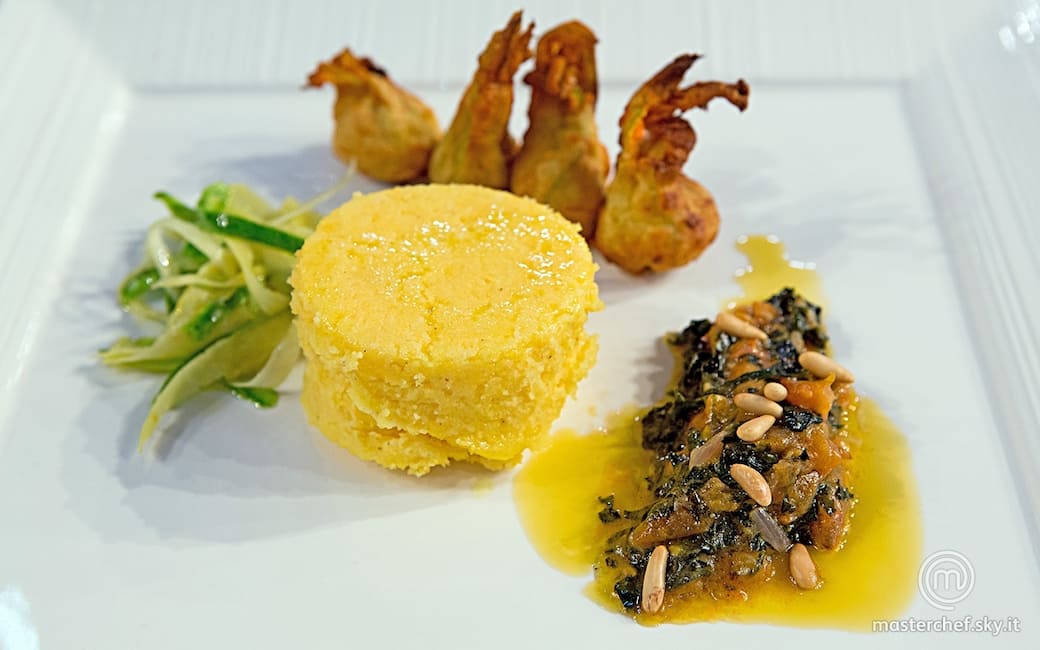 Utilizzare un coppapasta rotondo e ricavare dei cilindri di polenta, da adagiare al centro dei piatti, quindi disporre sui lati i fiori di zucchina farciti, la julienne di zucchine e pastinaca e completare con le verdure stufate.