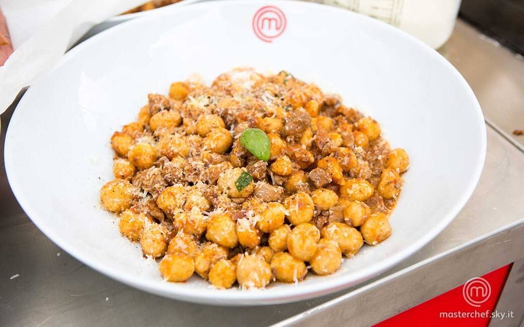 Prendere una piccola porzione di impasto e ricavare tanti gnocchetti rotondi, piuttosto piccoli, allineandoli a mano a mano sul piano di lavoro leggermente infarinato. Trasferire il ragù di carne giunto a cottura in una grande padella.