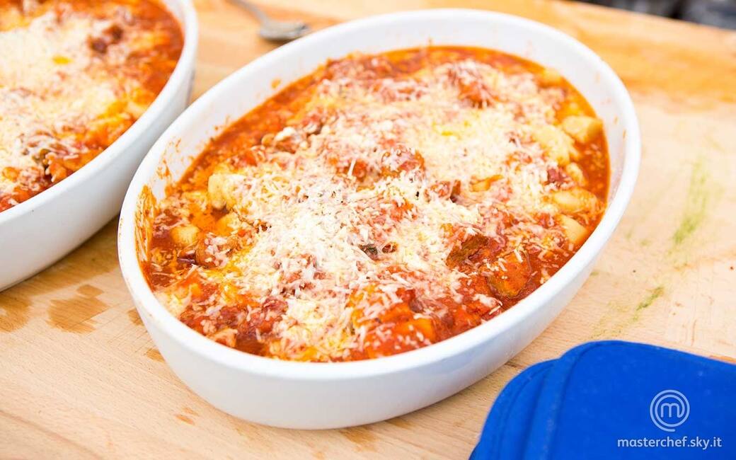 Cuocere gli gnocchi in abbondante acqua bollente salata per 1-2 minuti. Scolarli e condirli subito con il ragù di carne. Trasferire la preparazione in una pirofila e cospargere con la restante cacioricotta grattugiata. Passare la preparazione per pochi minuti in forno a 180 °C prima di servire.