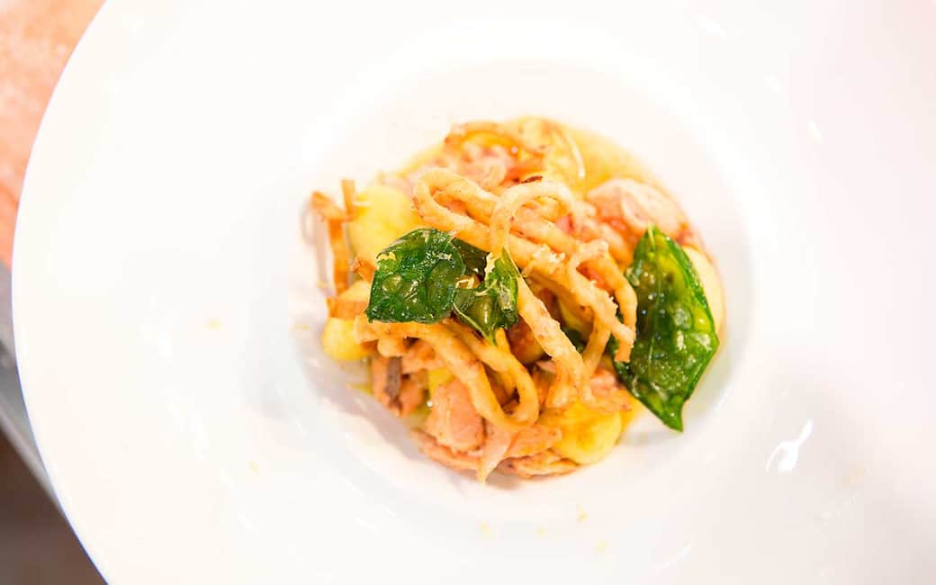 Versare sul fondo dei piatti un velo di liquido di cottura dei pesci con i filetti a pezzi e i dadini di fegato. Distribuire sopra gli gnocchi e completare con i cordoncini fritti e le foglie di basilico.
