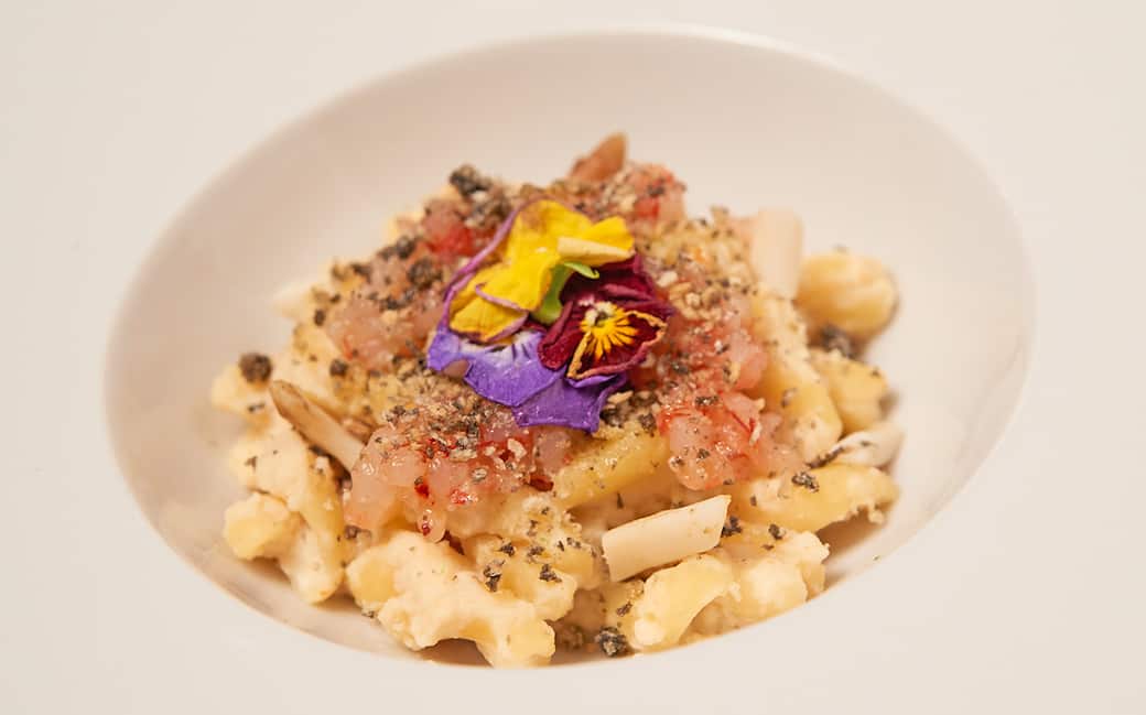 Cuocere la pasta in abbondante acqua bollente salata. Scolarla al dente e farla saltare per qualche minuto insieme alla crema di persico. Distribuire la pasta nelle fondine, aggiungere i cannolicchi e adagiare sopra la tartare di gamberi. Cospargere con il panko al nero di seppia e guarnire con i fiori.