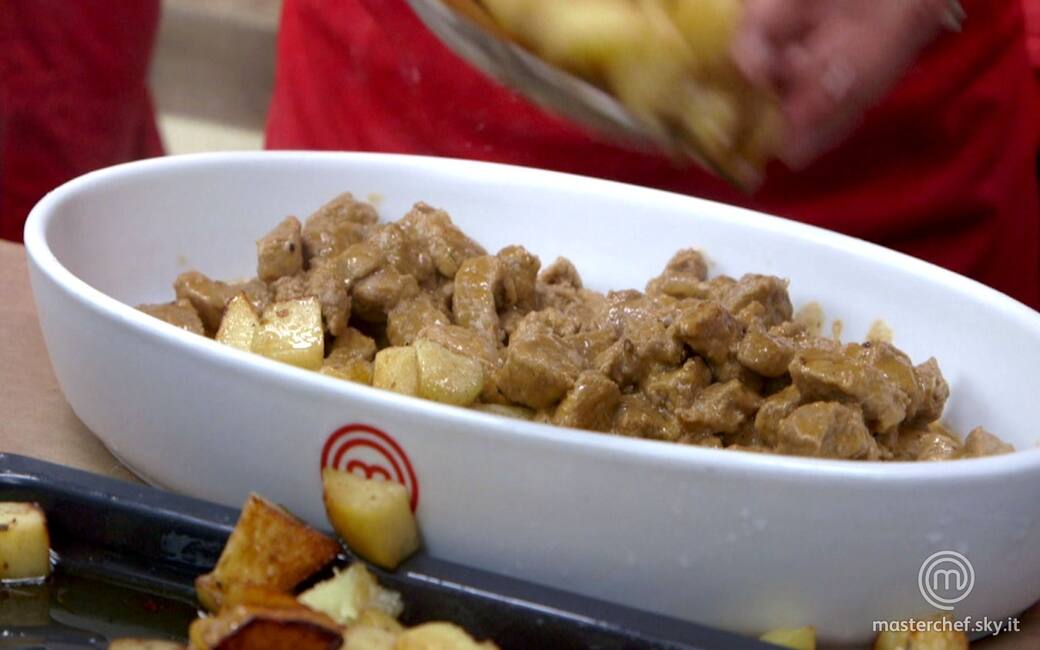 Lavare bene le patate e lessarle con la buccia per circa 30 minuti in abbondante acqua bollente: dovranno rimanere piuttosto sode. Scolarle, sbucciarle e tagliarle a fettine o a pezzetti. Tagliare nello stesso modo anche la carne, dopo aver eliminato le parti più grasse.