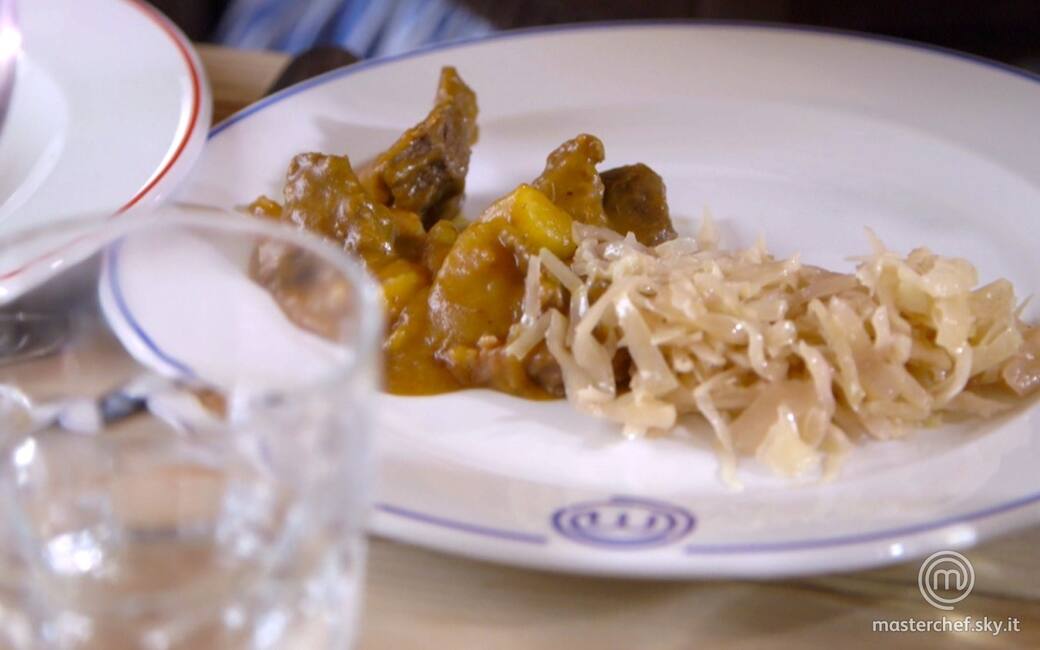 Distribuire il gulasch nei piatti insieme alle patate e al suo sugo, accompagnando a piacere con dei crauti. Se il sugo risultasse troppo liquido, è possibile addensarlo cuocendolo per pochi minuti con un'aggiunta di poca acqua fredda dove è stata sciolta della fecola di patate.