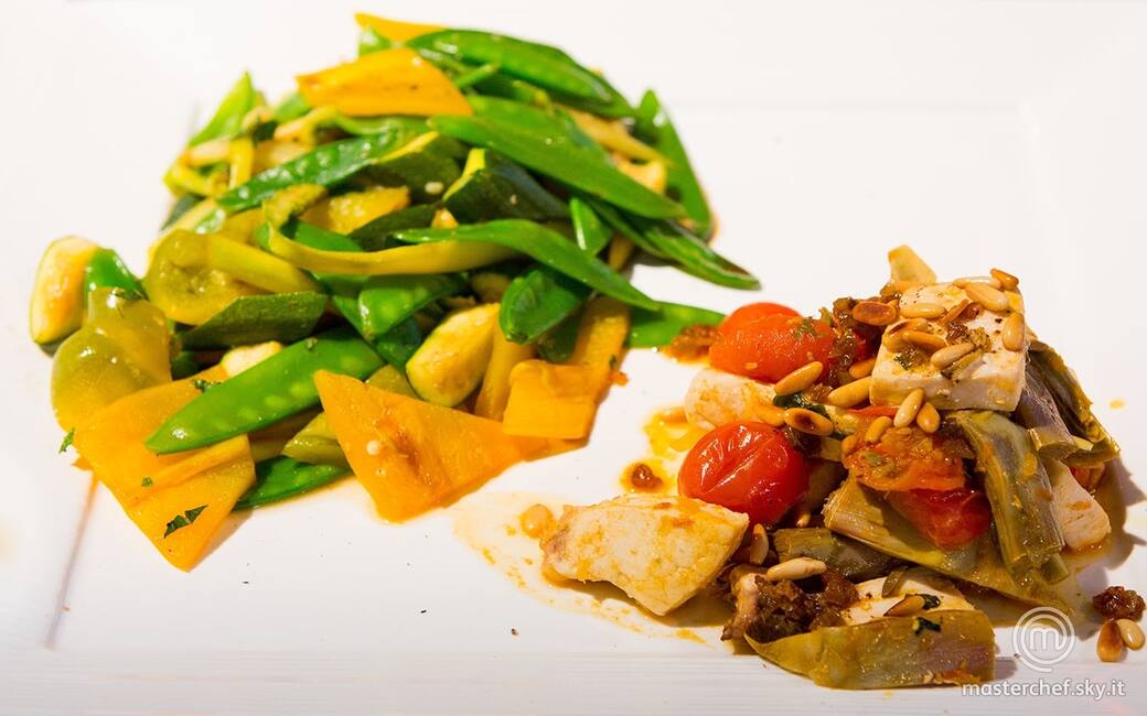 Adagiare su un lato dei piatti le verdure miste e con l'aiuto di un coppapasta sistemare di fianco il pesce spada con i pomodori e i carciofi. Guarnire con i pinoli tostati e l'uvetta, strizzata e sminuzzata.