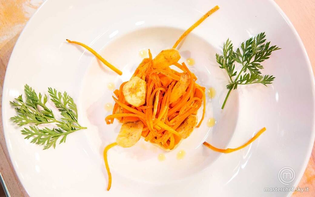 Pelare le carote, tagliarle a julienne e saltarle in una padella con olio extravergine di oliva, uno spicchio d'aglio in camicia e una grattugiata di noce moscata.