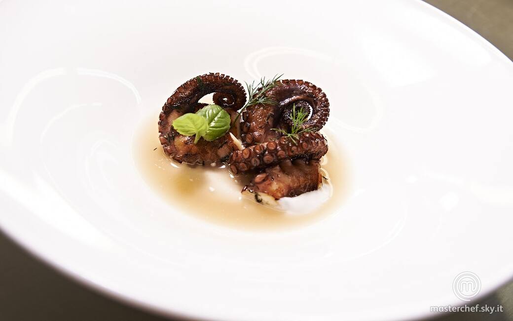 Distribuire una cucchiaiata di maionese sul fondo di ogni piatto, adagiarvi sopra i pezzi di polpo croccante, bagnare con dell'acqua di polpo filtrata e guarnire a piacere con erbe aromatiche.