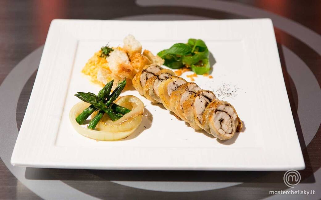 Pulire e tagliare la cipolla ad anelli, dorarli nel burro rimasto e scolarli su un foglio di carta assorbente. 6 Tagliare gli involtini a fette e disporli sui piatti, posizionando su un lato le cipolle con gli asparagi, sull'altro gli anelli di friggitelli, completando con il purè di carote condito con un filo d'olio.