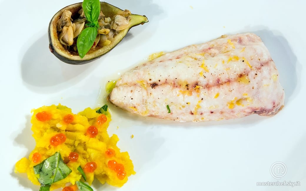 Distribuire la colatura di provolone sul fondo dei piatti, adagiarvi sopra i filetti di gallinella e insaporirli con una grattugiata di scorza di limone. Formare di lato una quenelle scomposta con il composto di patate e distribuirvi sopra le uova di trota. Tagliare a metà i fichi tenuti da parte ed eliminare la polpa, facendo attenzione a non rompere l'involucro. Riempire le coppette ottenute con i lupini di mare, condirli con il loro fondo di cottura e guarnire con le cimette di basilico tenute da parte. Completare con un filo d'olio, sale e pepe.