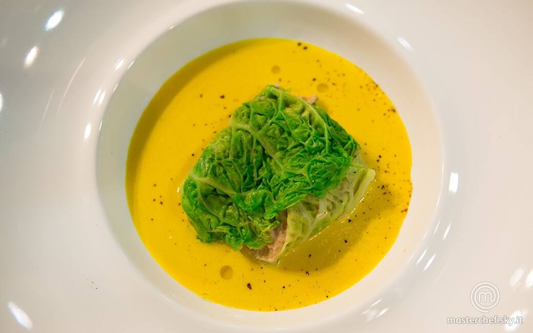 Pulire i peperoni e frullarli con olio, sale, pepe e poca cipolla tritata. Passare al colino il composto ottenuto per ottenere una crema liscia e omogenea. Sbollentare le foglie di verza, poi raffreddarle subito in acqua e ghiaccio.
