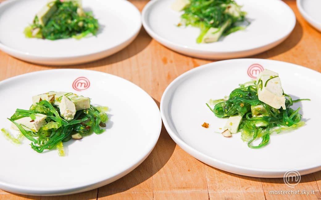 Nel frattempo, scaldare leggermente dell'acqua in un pentolino e immergervi le alghe. Lasciare che diventino morbide, poi scolarle.