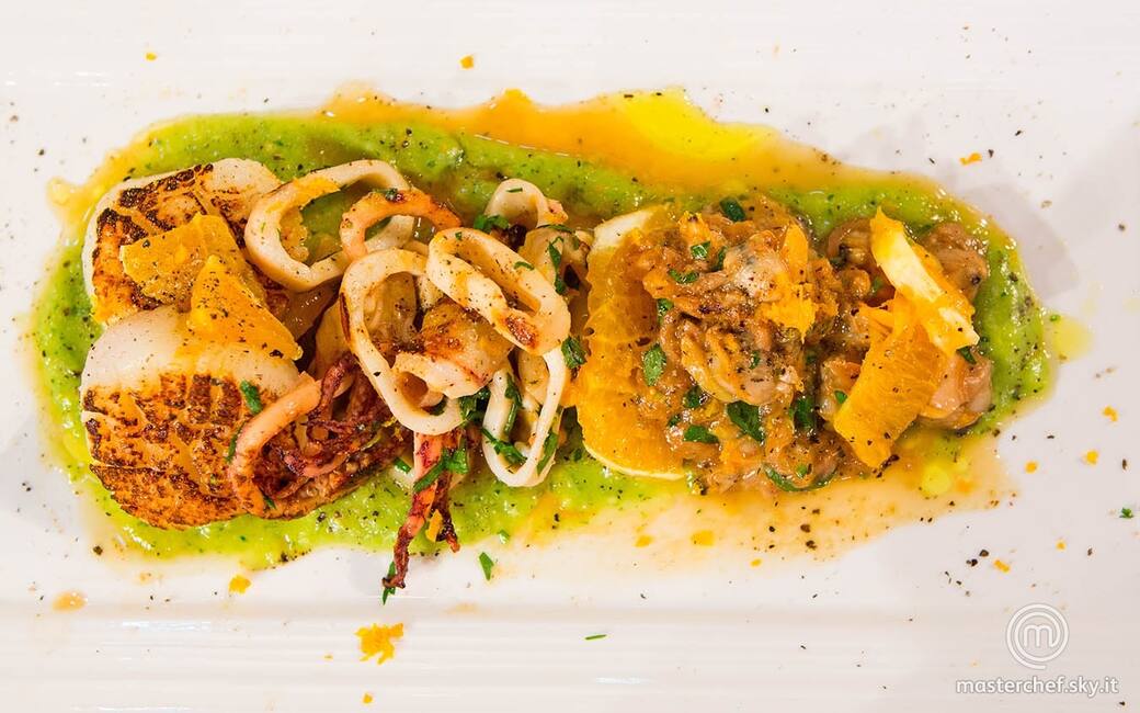 Stendere poca crema di avocado sul fondo dei piatti e adagiarvi sopra, su un lato, le capesante con alcuni pezzetti di arancia pelata al vivo. Aggiungere al centro il totano con altri pezzetti di arancia e infine, sul lato opposto, disporre le vongole con la pesca. Insaporire con un giro d'olio, regolare di sale e pepe e completare con poca scorza di arancia grattugiata.