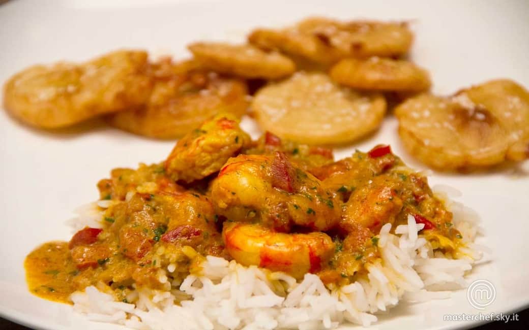 Stendere nei piatti la salsa di latte di cocco con i gamberi e disporvi sopra il riso basmati. Accompagnare con frittelle di banana ancora calde e spolverare con semi di sesamo.